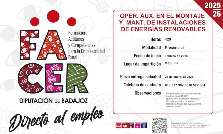 La Diputación de Badajoz, a través del Proyecto FACER, impulsa la acción formativa 'Operaciones básicas en el montaje y mantenimiento de instalaciones de energías renovables', que se impartirá de forma presencial en la localidad de Maguilla durante el mes de febrero.