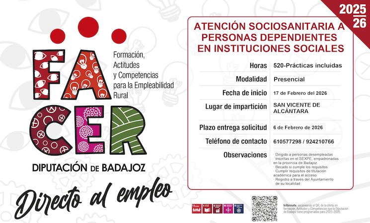El Proyecto FACER, desarrollado por la Diputación de Badajoz a través del Área de Formación y Capacitación para el Empleo, inició la pasada semana la difusión de una nueva acción formativa bajo la denominación 'Atención sociosanitaria a personas dependientes en instituciones sociales', cuyo plazo de inscripción permanecerá abierto hasta el 6 de febrero de 2026.