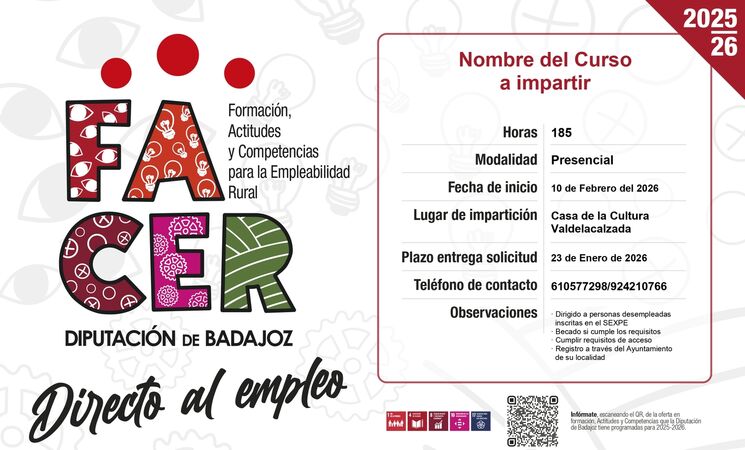 Cabe destacar que la acción formativa forma parte del Proyecto Facer (Formación, Actitudes y Competencias para la Empleabilidad Rural), desarrollado por el Servicio de Capacitación para el Empleo y Formación Profesional, dependiente del Área de Formación y Capacitación para el Empleo de la Diputación de Badajoz, e integrada en el Programa de Empleo, Educación, Formación y Economía Social (Efeso) del Fondo Social Europeo Plus (FSE+) 2021-2027.
