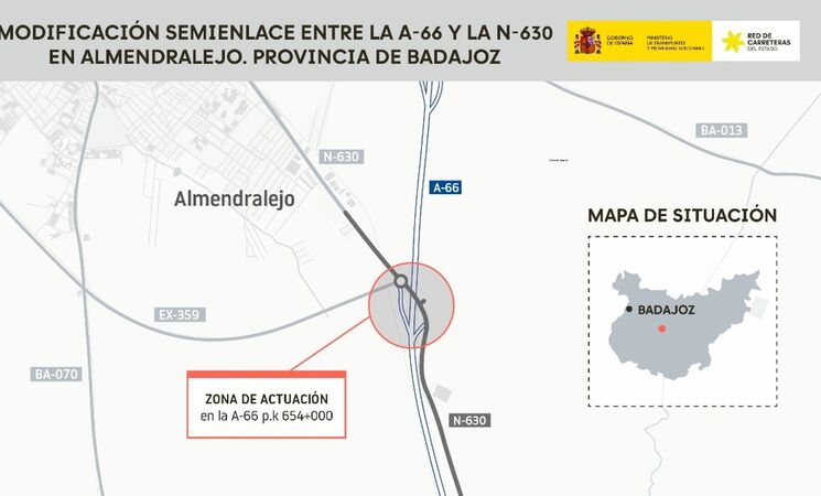 El Ministerio de Transportes y Movilidad Sostenible ha aprobado provisionalmente el proyecto de construcción para la modificación del semi-enlace situado en el kilómetro 654 de la Ruta de la Plata, en la A-66, a la altura del término municipal de Almendralejo, en la provincia de Badajoz, que cuenta con un presupuesto de 5,3 millones de euros (IVA incluido).