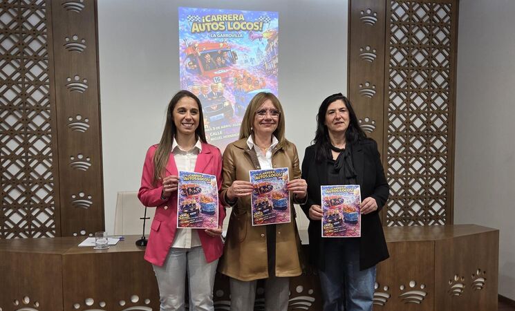 La diputada provincial Paqui Silva, la alcaldesa de La Garrovilla, Anabel Frutos, y la teniente de alcalde, Cristina Romero, han presentado esta nueva edición de los 'Autos Locos' en la que el plazo de inscripción está abierto por sede electrónica y cada auto participante recibe una subvención de 150 euros para su elaboración.