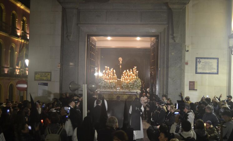 Con 28 costaleros, la patrona de Badajoz recorre las calles del Casco Antiguo de luto riguroso, sin corona ni joyas, únicamente porta en sus manos un rosario y un pañuelo blanco. Le acompañan miles de personas que rezan el rosario a lo largo de su estación de penitencia. Suele ir ataviada con un manto negro bordado en azabache que le hicieron con el traje de novia que le regaló en 1929 la condesa de la Torre del Fresno.