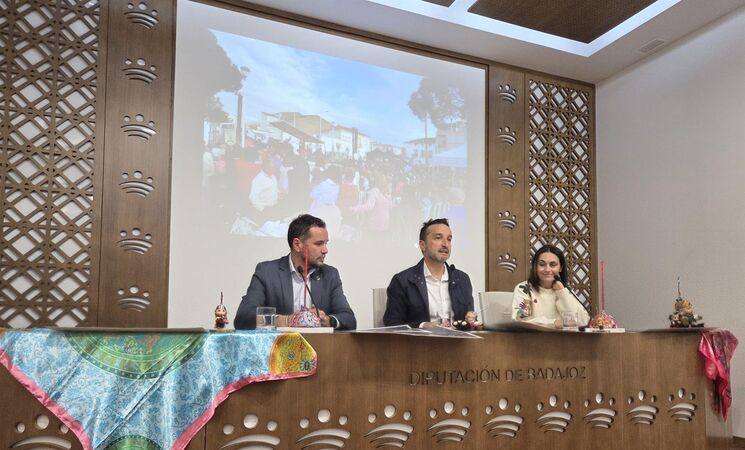 El diputado de Identidad Cultural, Deporte y Juventud, Ricardo Cabezas; junto al alcalde de Navalvillar de Pela, Francisco Javier Fernández, y la presidenta de la asociación 'El Calderero', Belén Cañada, han presentado esta nueva edición de un evento vinculado a las tradiciones y que demuestra "cada año" que el mundo rural "está más vivo que nunca", y que aúna igualmente degustaciones gastronómicas que ponen en valor otro de los "grandes" patrimonios pacenses, como la cocina tradicional como motor de atracción turística y de desarrollo económico.