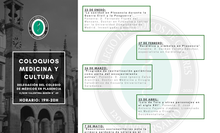 El Colegio de Médicos de Cáceres celebrará su 120 aniversario con un Ciclo de Conferencias sobre medicina y cultura, que ofrecerá cinco ponencias entre enero y mayo en su delegación de Plasencia.