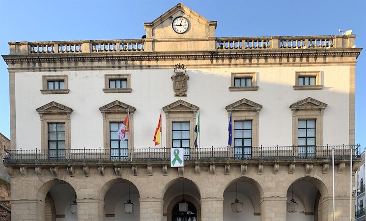 La fachada principal del Ayuntamiento de Cáceres luce desde este pasado lunes un lazo verde, que se ha colocado en la balconada que da a la Plaza Mayor, en apoyo a las reivindicaciones de los agricultores y ganaderos extremeños que están protagonizando este martes una jornada de protesta en las carreteras extremeñas para pedir unos precios justos.