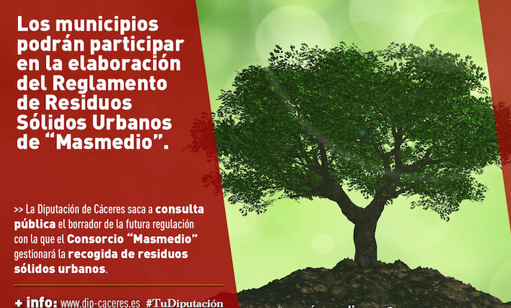 Los municipios de la provincia de Cáceres pueden participar en la elaboración del reglamento del consorcio Masmedio, que ha puesto en marcha la Diputación de Cáceres, y cuyo borrador se ha sacado a consulta pública para que las localidades aporten sugerencias al funcionamiento de este órgano que gestionará la recogida de residuos sólidos urbanos.