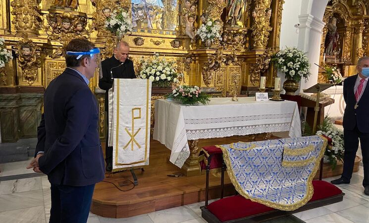 El Rotary Club Cáceres entregó el pasado sábado un manto que combina los colores azul y amarillo a la Virgen de la Montaña, los mismos tonos corporativos de Rotary Internacional.