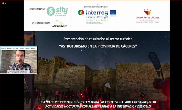 La Diputación de Cáceres, a través del Área de Reto de Demográfico, Desarrollo Sostenible, Juventud y Turismo, ha organizado una reunión telemática con empresas turísticas que operan en la provincia para la presentación de los resultados y trabajos realizados dentro del proyecto "Creación de Producto Turístico Cielo estrellado y actividades complementarias a la observación del cielo", incluido en el Proyecto Estrategia Global de Desarrollo Turístico (GLOBALTUR - EUROACE)