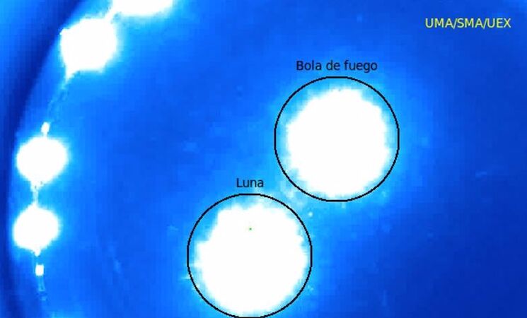 En la imagen difundida por la UMA se muestra el último fotograma del vídeo de Sierra de Fuentes y se señalan la luna llena y la bola de fuego, permitiendo comparar su brillo. "Precisamente se denomina bola de fuego a los meteoros que, como este, igualan o superan en brillo a la luna llena", ha explicado Alberto Castellón, responsable de la Red de la UMA.