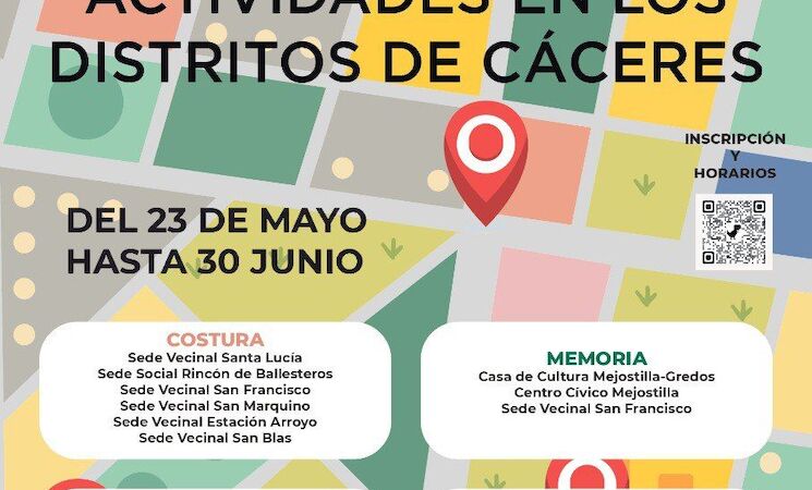 La concejalía de Participación Ciudadana y Barrios ha organizado talleres en los cinco distritos de Cáceres, incluidas las pedanías, que se desarrollarán del 23 de mayo al 30 de junio enmarcados en el contrato de dinamización de centros cívicos, casas de cultura, sedes vecinales y barriadas, y en los que se podrán inscribir cualquier persona independientemente del barrio donde resida.