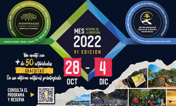 El área de Reto Demográfico, Desarrollo Sostenible, Juventud y Turismo de la Diputación Provincial de Cáceres organiza una nueva edición del Mes de la Reserva de la Biosfera de Monfragüe y Tajo/Tejo Internacional, un programa de más de 50 actividades de naturaleza, cultura, turismo activo y gastronomía que se llevarán a cabo entre el 29 de octubre y el 4 de diciembre de 2022, y en el que han participado de manera activa las empresas del territorio.