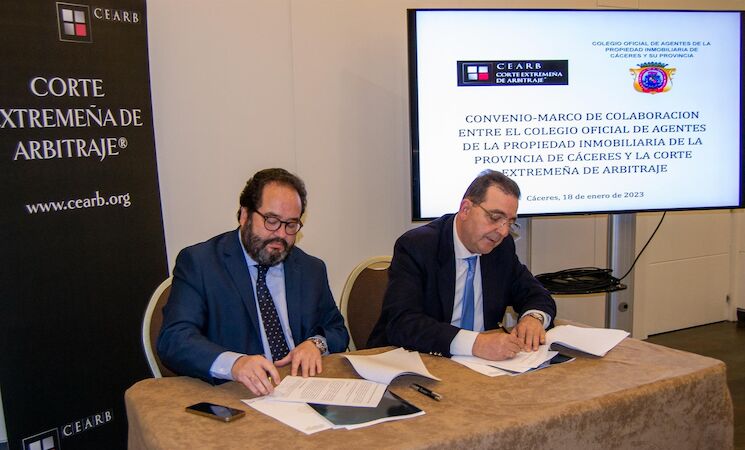 La Corte Extremeña de Arbitraje y el Colegio Oficial de Agentes de la Propiedad Inmobiliaria de la Provincia de Cáceres (Coapi) han firmado este miércoles un acuerdo de colaboración "activa" entre ambas entidades.