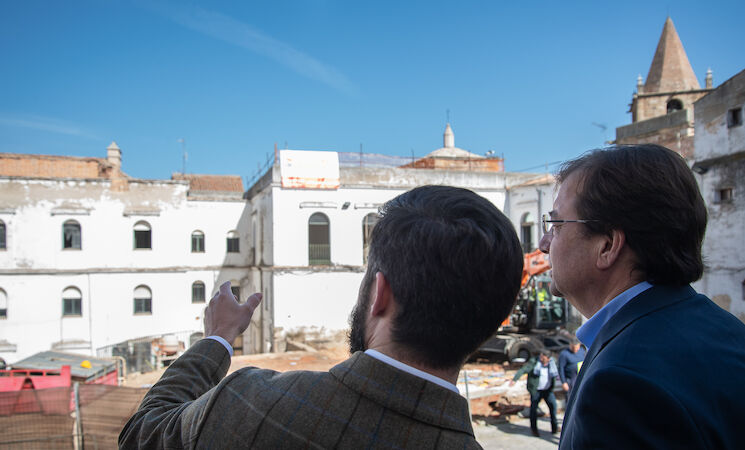 El presidente de la Junta de Extremadura, Guillermo Fernández Vara, ha visitado las obras de remodelación del Palacio de Godoy, que dan comienzo a la transformación de este edificio histórico, que data del siglo XVI, en un hotel de lujo en pleno recinto monumental de la capital cacereña.