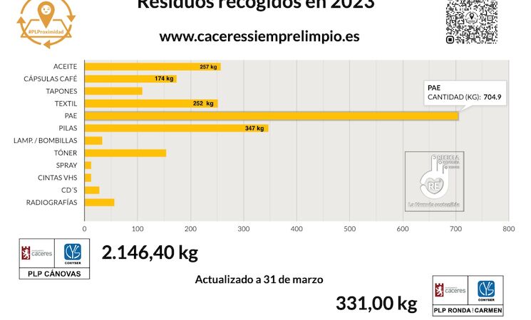 Los puntos limpios de proximidad ubicados en el Paseo de Cánovas y en el Mercado Ronda del Carmen de Cáceres han recogido 2.447,40 kilogramos en lo que llevamos de año, de los cuales 2.146,40 corresponden al del Paseo de Cánovas y 331 al mercado.