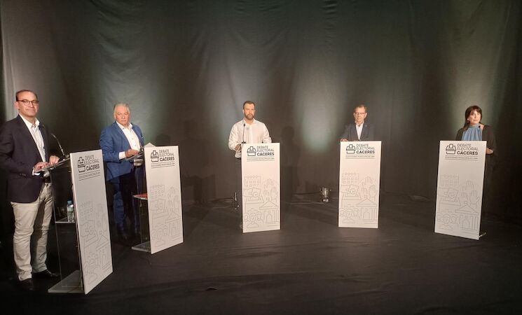 Los posibles pactos entre partidos para formar gobierno en el Ayuntamiento de Cáceres tras las elecciones municipales del próximo 28 de mayo, en caso de que ninguna formación consiga mayoría absoluta, la postura frente a la mina de litio en la Montaña o la retirada o permanencia de La Cruz, han centrado el debate entre los cinco candidatos de los partidos con representación en el consistorio cacereño (PSOE, PP, Cs, Unidas Podemos y Vox), que ha tenido lugar este viernes.