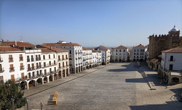La Plaza Mayor de Cáceres se ha vaciado este martes para la grabación con un dron que permitirá hacer una recreación en 3D de la parte antigua de la ciudad.