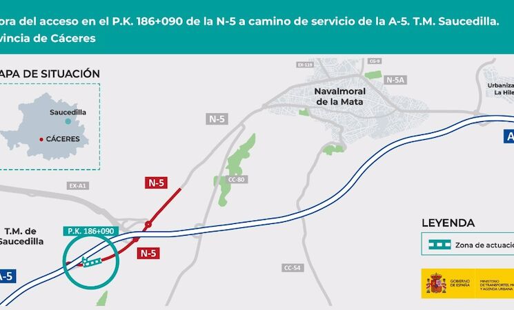 El Ministerio de Transportes, Movilidad y Agenda Urbana (Mitma) ha aprobado provisionalmente el proyecto de trazado de la mejora del acceso existente en la carretera N-V al camino de servicio de la A-5 en el p.k. (punto kilométrico) 186,090, en la margen izquierda, en el término municipal de Saucedilla (Cáceres).