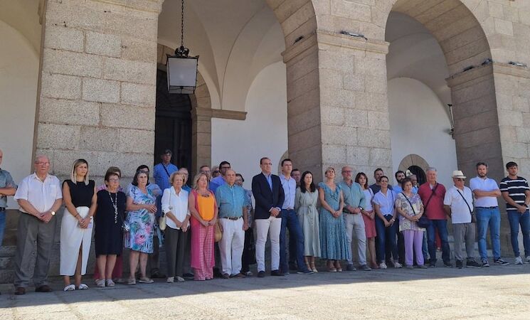 Miembros de la corporación del Ayuntamiento de Cáceres han guardado este lunes un minuto de silencio en las escalinatas del edificio consistorial como muestra de apoyo y solidaridad con las víctimas y sus familiares, por el incendio ocurrido en Murcia.