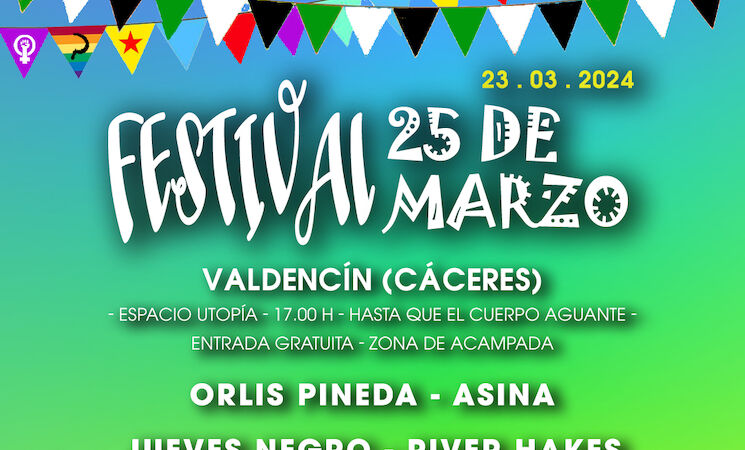 A las 17:00 horas comenzará el 'Festival 25 de marzo 2024' en Espacio Utopía con las actuaciones del cantautor cubano Orlis Pineda, y le seguirán un elenco de grupos extremeños actuales como El Pelujáncanu, Asina Önde, Jueves Negro, River Hakes, Asina, cerrando la noche el Dj Nesitas, quien acabará con una sesión de urban/tecnho.