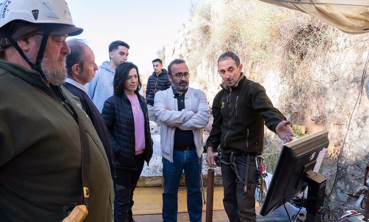 El presidente de la Diputación de Cáceres, Miguel Ángel Morales, junto a la vicepresidenta Primera, Esther Gutiérrez, ha conocido los trabajos desarrollados por el equipo Aranzadi se centran en desescombrar la mina y de hecho, cuando comenzaron hace dos años se estaba a 12 metros de profundidad y ahora mismo se ha llegado a los 25 metros de profundidad.