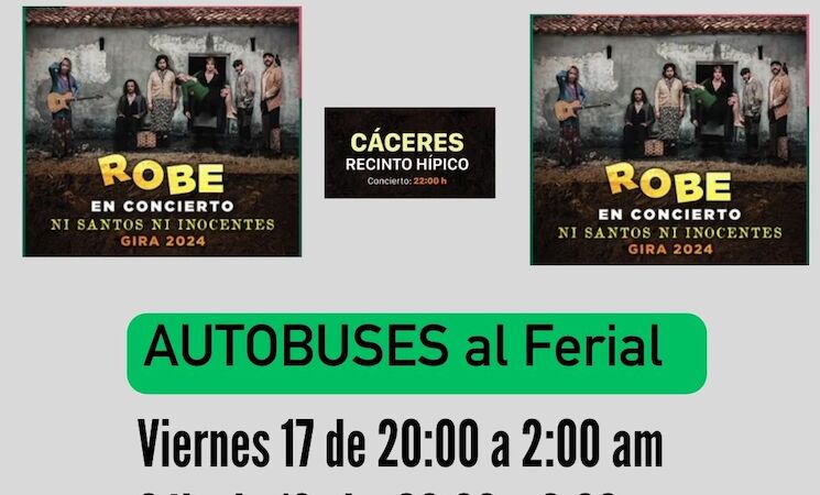 El Ayuntamiento de Cáceres refuerza la línea de autobús al Recinto Ferial y amplía en dos horas el horario de cierre en hostelería con motivo de los dos conciertos que el artista Robe dará en el Recinto Hípico este viernes y el sábado, días 17 y 18 de mayo a las 22:00 horas.