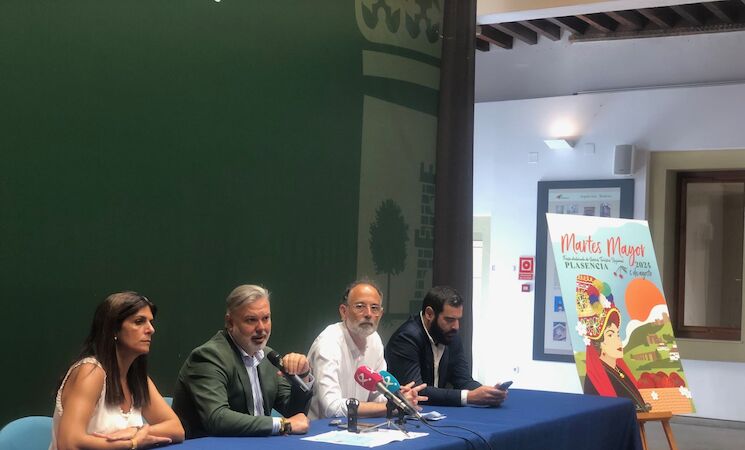 El secretario general de Cultura, Francisco Palomino, y el alcalde de Plasencia, Fernando Pizarro, han presentado una nueva edición del Martes Mayor placentino, un mercado que se celebrará el próximo 6 de agosto y en el que se dan cita la tradición, el folclore y la innovación, y que persigue su declaración como Fiesta de Interés Turístico Nacional.