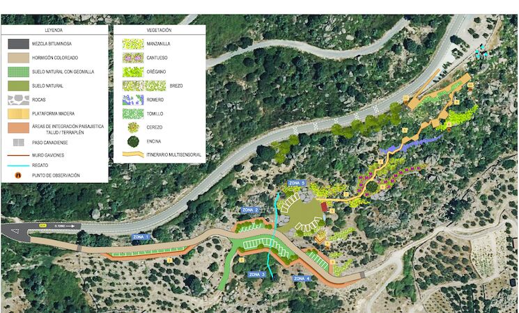 También se creará un recorrido peatonal segregado del tráfico hasta el Mirador de la Memoria, incorporando pasarelas de madera, escaleras, zonas de descanso y miradores; apertura de senderos y preparación de entornos a los bolos de granito para la práctica de escalada; áreas de esparcimiento y merenderos para la permanencia en el recurso turístico, y ajardinamiento con especies autóctonas y plantas aromáticas como el tomillo, el cantueso y el brezo para completar la experiencia.