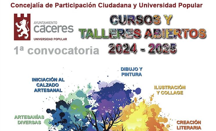 El Ayuntamiento de Cáceres ha anunciado la apertura del plazo de inscripción a la 1ª convocatoria de cursos y talleres abiertos de la Universidad Popular para el curso 2024-2025, que podrán realizarse a partir de este miércoles, 25 de septiembre, y hasta el próximo 1 de octubre.