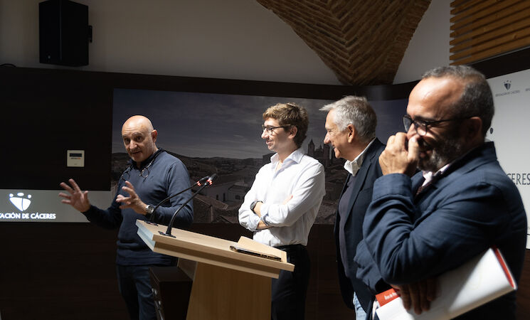 El presidente de la diputación cacereña y los responsables de la Fundación Atrio, Toño Pérez y José Polo, así como el gerente Miguel Galán, han presentado este jueves este programa de acciones formativas que se van a llevar a cabo, de momento, en las localidades de Moraleja, Miajadas, Trujillo y Navalmoral de la Mata, durante los próximos doce meses.