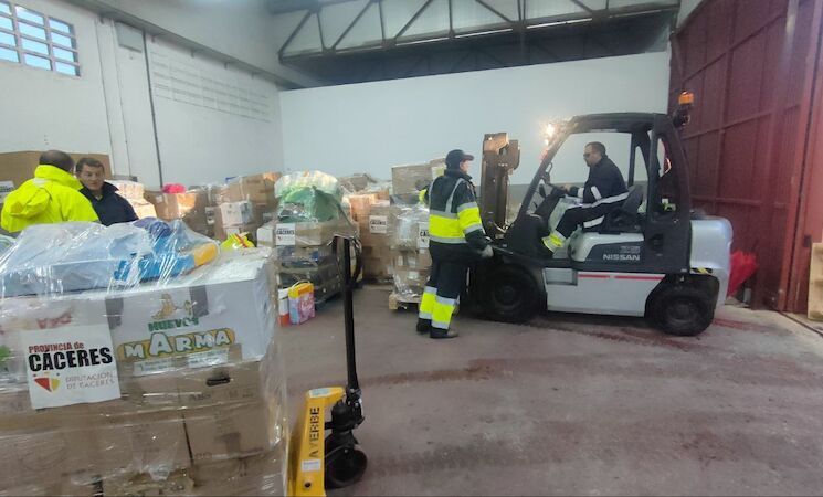 Leche, agua, material de limpieza, pañales, menaje de cocina, cubos, productos sin gluten o comida para mascotas son algunos de los artículos que este lunes se han estado cargando en las instalaciones de Parque Móvil de la Diputación de Cáceres en dos camiones de transportes, que ya se encuentran de camino hacia Sedaví (Valencia), para los afectados por la DANA.