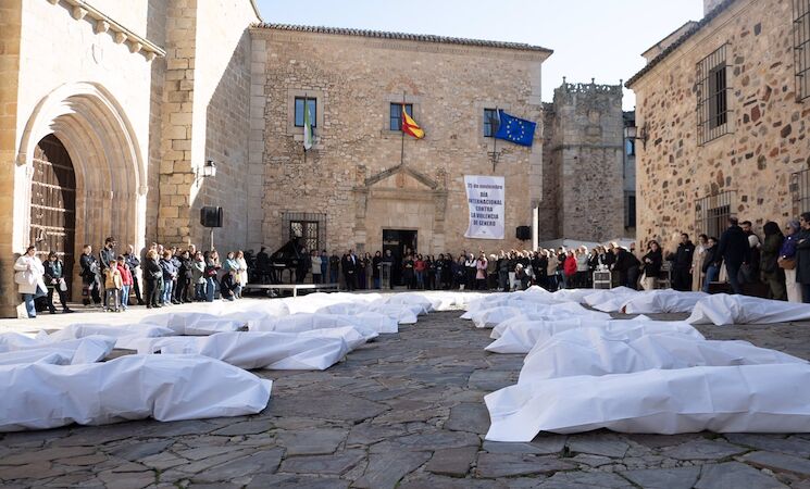 La Diputación de Cáceres se ha sumado este 25N a la conmemoración del Día Internacional de la Violencia contra las Mujeres con un emotivo acto a las puertas del palacio provincial en la capital cacereña.