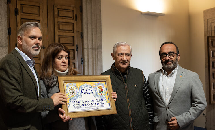 El máximo responsable de la Institución provincial cacereña ha asistido en Plasencia al acto de entrega a la familia de Charo Cordero de la copia del azulejo que se instalará en el entorno de la Puerta Trujillo y el parking de la Calle Eulogio González, espacio que pasará a tener el nombre de la que fuera presidenta de la Diputación de Cáceres, fallecida en diciembre de 2020, y se llamará 'Plaza María del Rosario Cordero Martín'.