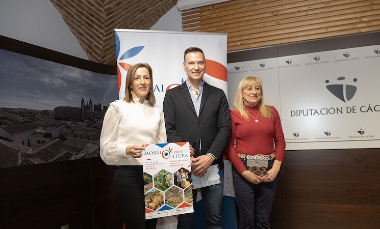 La diputada de Turismo de la Diputación de Cáceres, Elísabeth Martín; el alcalde de Casar de Palomero, Óscar Fernández, y la presidenta de la Asociación Mosaico, Natividad Alviz, han presentado este miércoles la programación de 'Mosai Cultura', como proyecto de innovación social contra la despoblación.