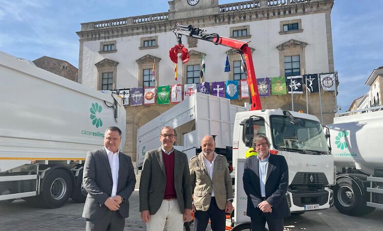 El alcalde de Cáceres, Rafael Mateos, ha presentado este martes junto al concejal de Servicios Públicos, Pedro Muriel, y el director de Zona Sur de Servicios Urbanos de Valoriza, Juan Carlos Uzal, la nueva imagen y los nuevos vehículos y maquinaria del servicio de limpieza viaria y de recogida de residuos de Cáceres.