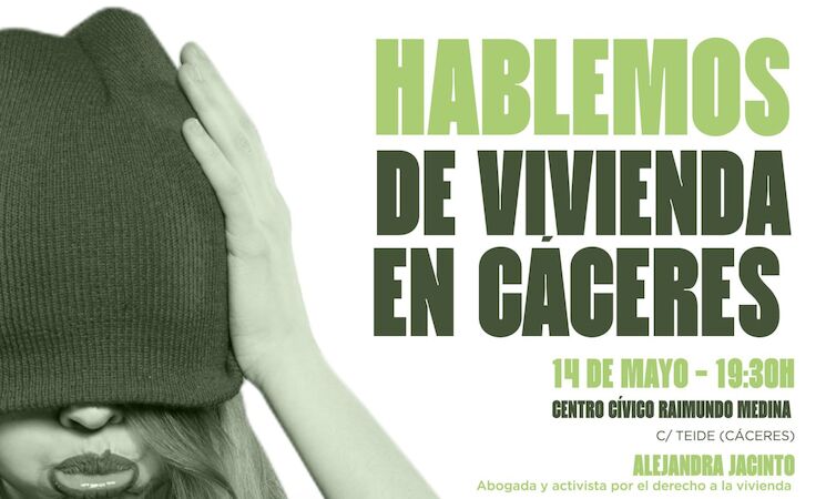 La abogada y activista por el derecho a la vivienda, Alejandra Jacinto, participará en un debate que tendrá lugar este miércoles, 14 de mayo, en el Centro Cívico Raimundo Medina de Cáceres, en el que se abordará la situación de la vivienda en la capital cacereña.
