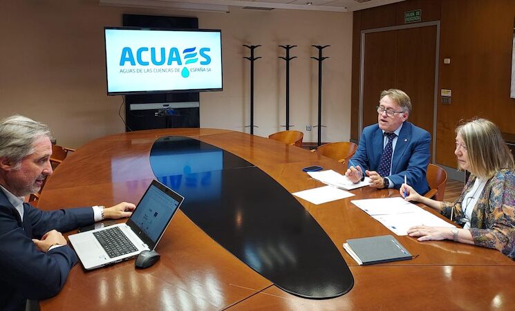 El secretario general de Desarrollo Sostenible, Coordinación y Planificación Hídrica, Víctor del Moral, se ha reunido hoy en Madrid con la presidenta de la Sociedad Mercantil Estatal Aguas de las Cuencas de España (ACUAES), Mª Rosa Cobo, para acordar los términos de la participación financiera de la Consejería de Agricultura, Ganadería y Desarrollo Sostenible en el convenio a suscribir para la ejecución, financiación y explotación de las obras de mejora de los sistemas de abastecimiento "en alta" a Cabezuela del Valle y Pasarón de la Vera, en la provincia de Cáceres.