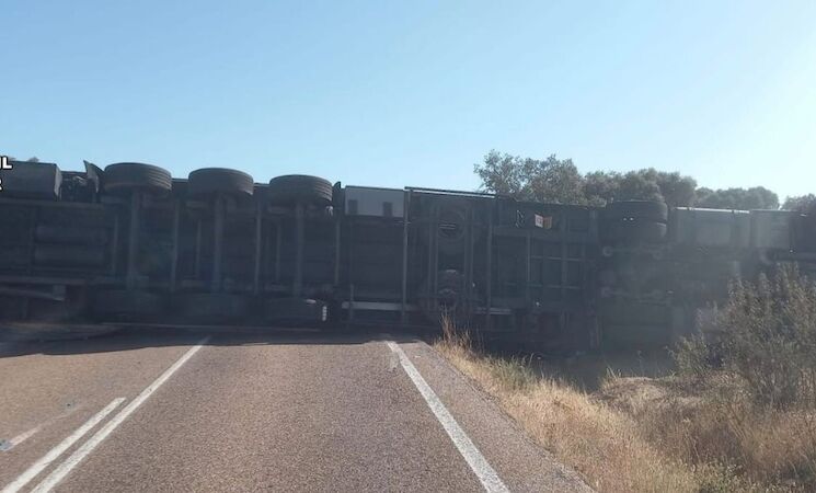 Cabe recordar que el accidente tuvo lugar a las 10,30 horas de este pasado lunes, cuando un camión articulado volcó en el kilómetro 11 de la carretera EX-303, ocupando toda la calzada, y su conductor y único ocupante del vehículo, un hombre de 44 años, fue trasladado al Hospital de Cáceres.