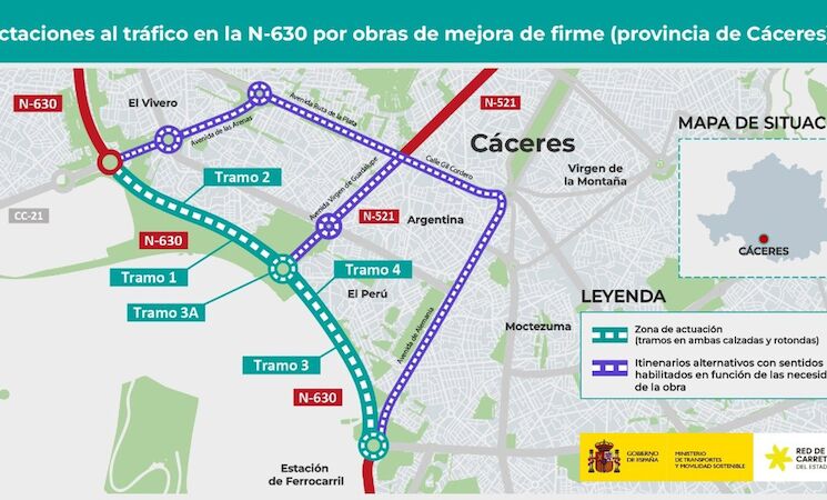 El Ministerio de Transportes y Movilidad Sostenible está ejecutando las obras de rehabilitación del firme de la carretera N-630, a su paso por la ciudad de Cáceres entre los kilómetros 553,050 y 554,650, en el tramo conocido como Avenida del Ferrocarril, lo que obligará a modificar la circulación en algunas ocasiones, para lo que se ha establecido un itinerario alternativo.