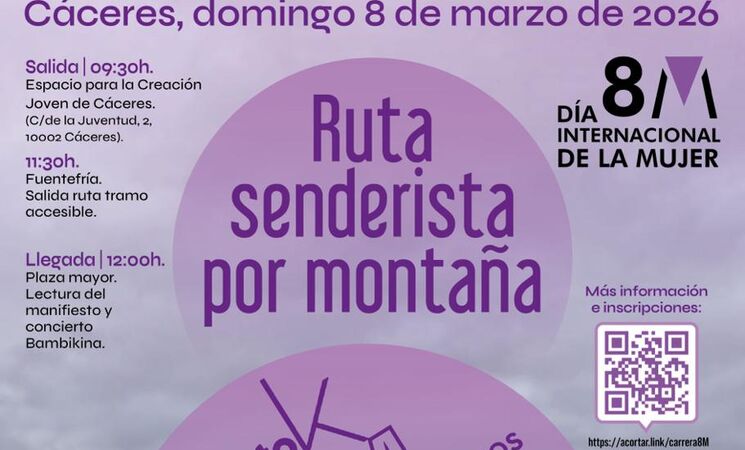El Ayuntamiento de Cáceres, a través de la concejalía de la Mujer, en colaboración con la Federación Extremeña de Montaña y Escalada (FEXME), ha organizado la ruta senderista por montaña "Reto 8M: 8K, 8 Motivos por la igualdad", que se celebrará el domingo 8 de marzo, con motivo de la conmemoración del Día Internacional de la Mujer.