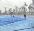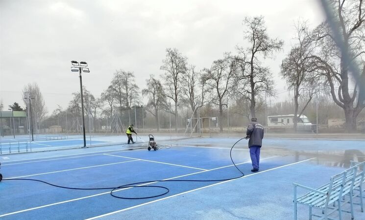 En concreto, la pista de baloncesto y la pista de atletismo continúan con labores de limpieza, mientras que las cuatro pistas de pádel están pendientes de la sustitución de la superficie de césped artificial.