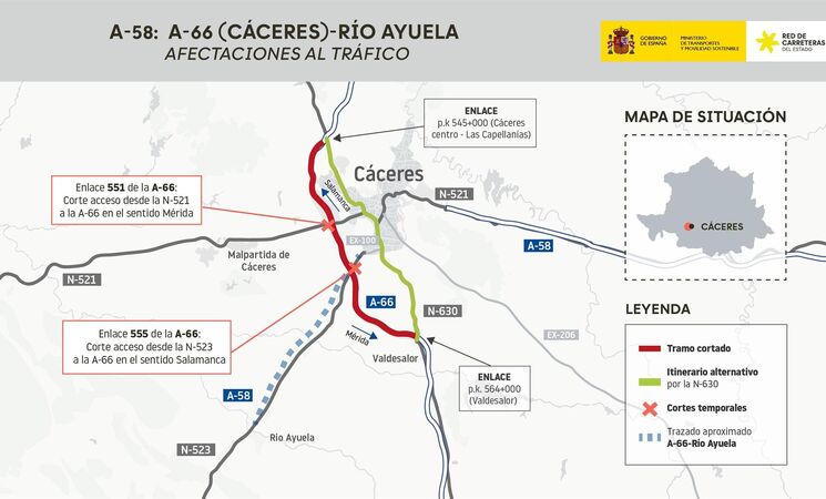 Por su parte, en la N-521 (enlace con la A-66 del kilómetro 551) se cortará temporalmente el acceso a la A-66 en el sentido Mérida, mientras que también en la N-521, en el enlace con la A-66 del kilómetro 555, se cortarán temporalmente los accesos a la A-66 en el sentido Salamanca.