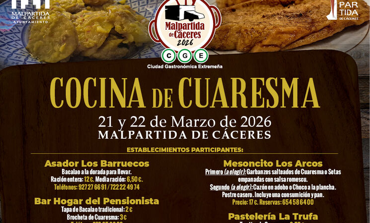 La 'Cocina de Cuaresma' protagoniza la programación de la Capitalidad Gastronómica 2026 de Malpartida de Cáceres para el mes de marzo, una iniciativa que pretende poner en valor la riqueza culinaria del municipio y el "importante papel" que desempeñan los establecimientos hosteleros locales.