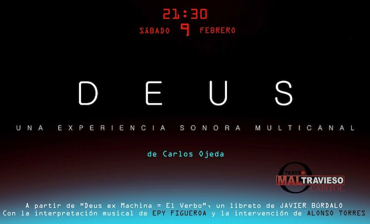 Según Ojeda, DEUS es una adaptación de la instalación sonora 'Deus Ex Machina = El Verbo', que se hizo a partir de un libreto de Javier Búrdalo, bajo encargo del extinto Festival de Arte y Música Electrónica 'Maquin@rte' en el Auditorio de Cáceres (actual Palacio de Congresos), en su edición del 2006.