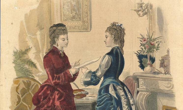 Los figurines estaban protagonizados casi en exclusiva por mujeres, la mayoría de las veces en pareja, como en este caso. En algunas ocasiones aparecían niños y apenas varones. Todos los casos reflejan escenas costumbristas, de interior y exterior, en las que se mostraban los trajes y complementos con "extraordinaria riqueza".
