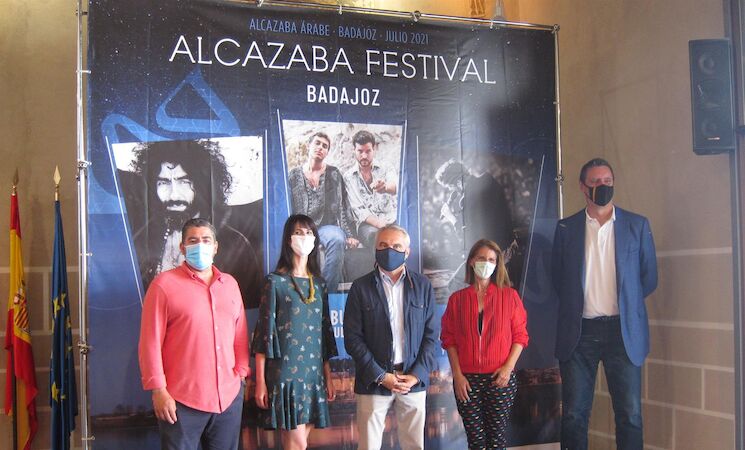 El responsable de Alcazaba Festival, Carlos Lobo; la secretaria general de Cultura de la Junta, Miriam García Cabezas; y el alcalde de Badajoz, Francisco Javier Fragoso, acompañados de los concejales de Cultura, Paloma Morcillo, y de Juventud, Juancho Pérez, han presentado estos conciertos en una rueda de prensa en las Casas Consistoriales en la que Lobo ha detallado que el aforo pasa de las 8.000 entradas de ediciones anteriores a 2.500, junto a medidas sanitarias entre las que se cuenta que no habrá zona gastronómica ni barra.