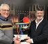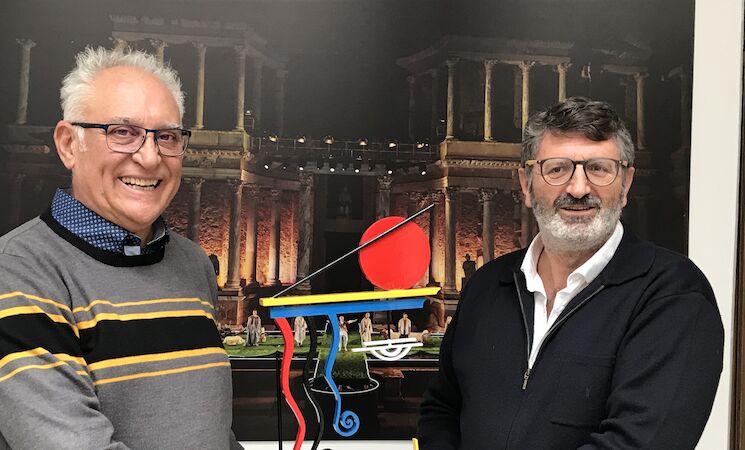 El gerente del Consorcio Patronato Festival de Mérida, Pedro Blanco, ha recibido de manos del artista Miguel Sansón, la escultura de la imagen de la uniformidad del evento esta última edición, presente en camisetas y mascarillas.