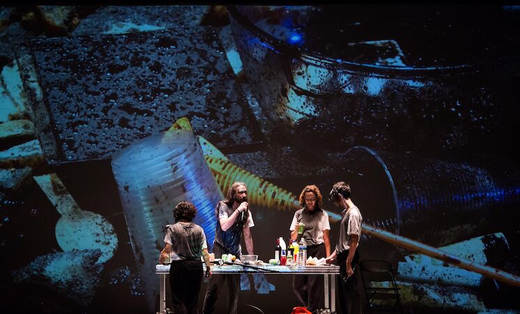Concretamente, se trata de un montaje a partir de un texto de Manuel Benito "surgido a modo de vómito de palabras e ideas, escrito sin divisiones, sin personajes, sin indicaciones, sin reglas de puntuación, en minúsculas casi en su totalidad con espacios y tabulaciones aleatorias, con datos periodísticos, estadísticas, discursos de sectas suicidas y de Klaus Kinski".