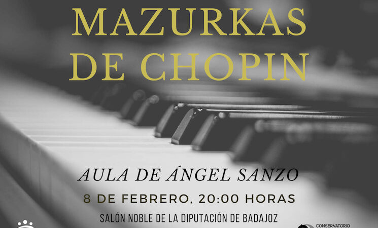 El Conservatorio Superior de Música 'Bonifacio Gil' de Badajoz ofrecerá este martes, 8 de febrero, a las 20:00 horas en el Salón de Noble de la Diputación de Badajoz un recital monográfico sobre las mazurkas de F. Chopin.