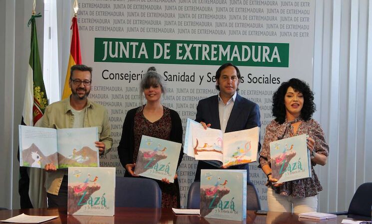 La directora general de Servicios Sociales, Infancia y Familias de la Junta de Extremadura, Carmen Núñez, y el secretario general de Presidencia, Fernando Blanco, han presentado este miércoles el audiolibro 'Zazá y la historia de Rui', junto al psicólogo Fran Serrano y la presidenta de la Asociación 'Cuéntame algo que me reconforte', Alicia Chamorro.