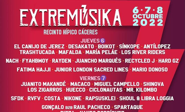 La organización del festival Extremúsika, que se celebrará los días 6, 7 y 8 de octubre en el recinto hípico de Cáceres con lo mejor del rock, hip hop y rap, fusión y mestizaje, música urbana, trap y electrónica, ha anunciado su cartel dividido por días, que incluyen una veintena de artistas en cada una de las tres jornadas.